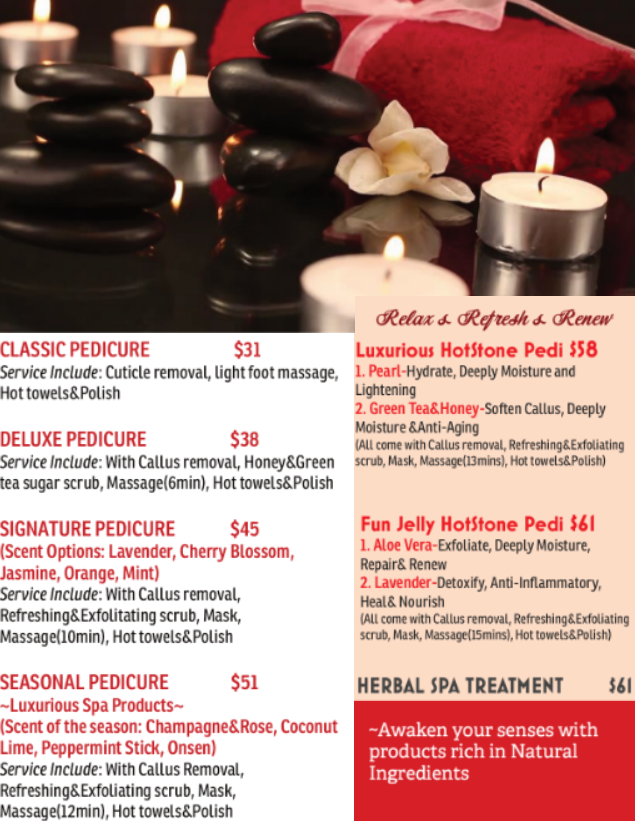 (Scent of your choice) Using formulating of the most finest, natural, environmentally-conscious product line will make your skin smoother, hydrated, and relaxed. Following with 13 mins foot massage and hot towels.