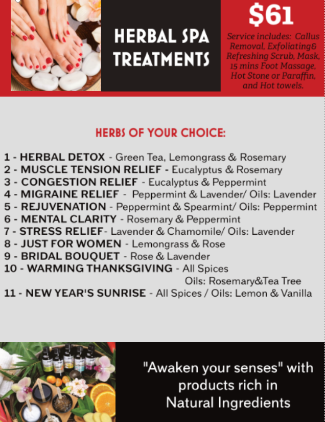 We are excited to announce the newest addition to our Spa Pedicure menu ~ "Botanical Escapes Herbal Spa Pedicure" ~ 60 total relaxation, healing, and nourishing. This spa service is worthy to "awaken your senses" with products rich made from Natural Ingredients.